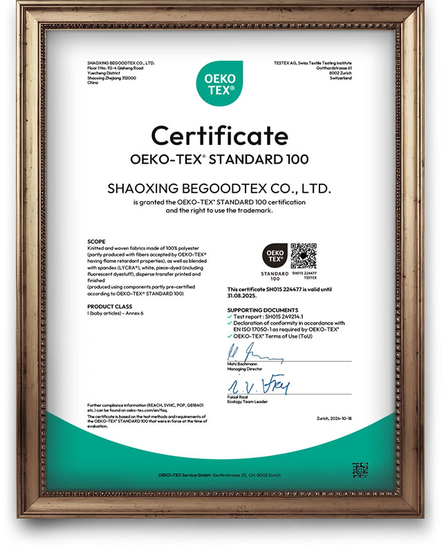 To ensure the safety and functionality of our fabrics in global markets, BEGOODTEX® conducts comprehensive laboratory testing across all product lines. Our fabrics undergo rigorous testing in accordance with international standards, covering flame retardancy, as well as physical strength, chemical safety, durability, and comfort. All reports are issued by third-party accredited laboratories and comply with certification systems in multiple countries and regions, ensuring top performance across various applications.
